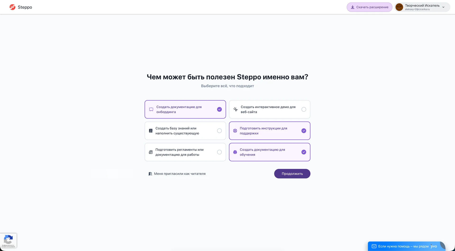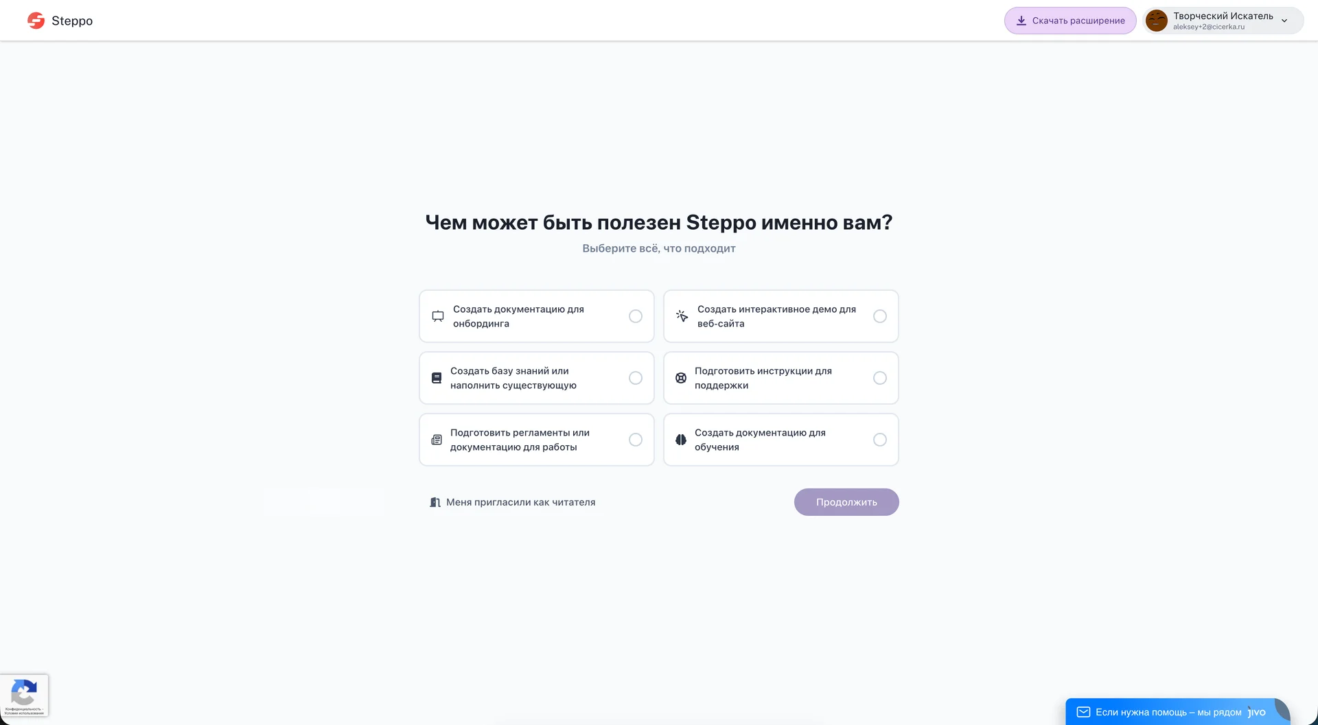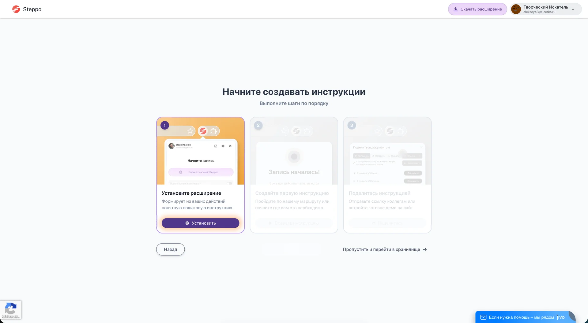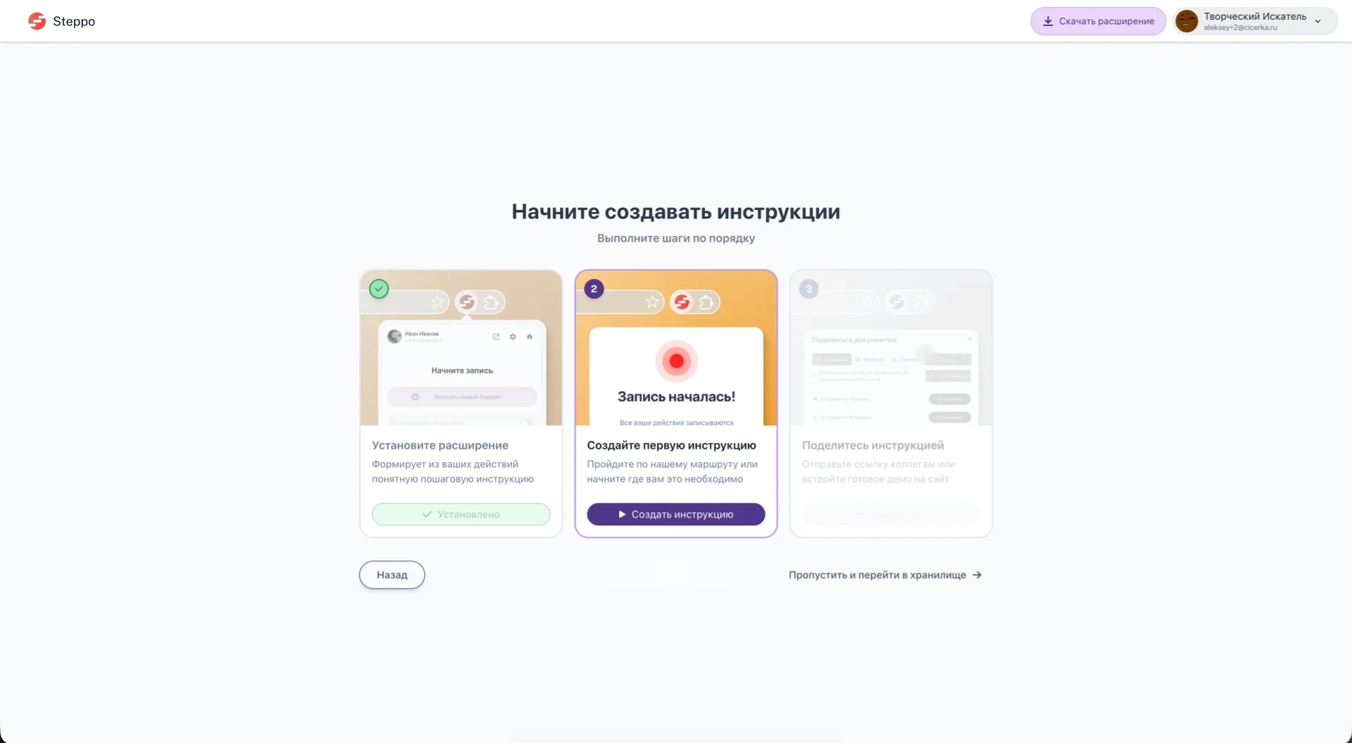 В данной инструкции будет рассмотрено прохождение маршрута он-бординга новых пользователей. В процессе этого маршрута Вы сможете ознакомиться с основным функционалом записи пошаговых инструкций в Steppo