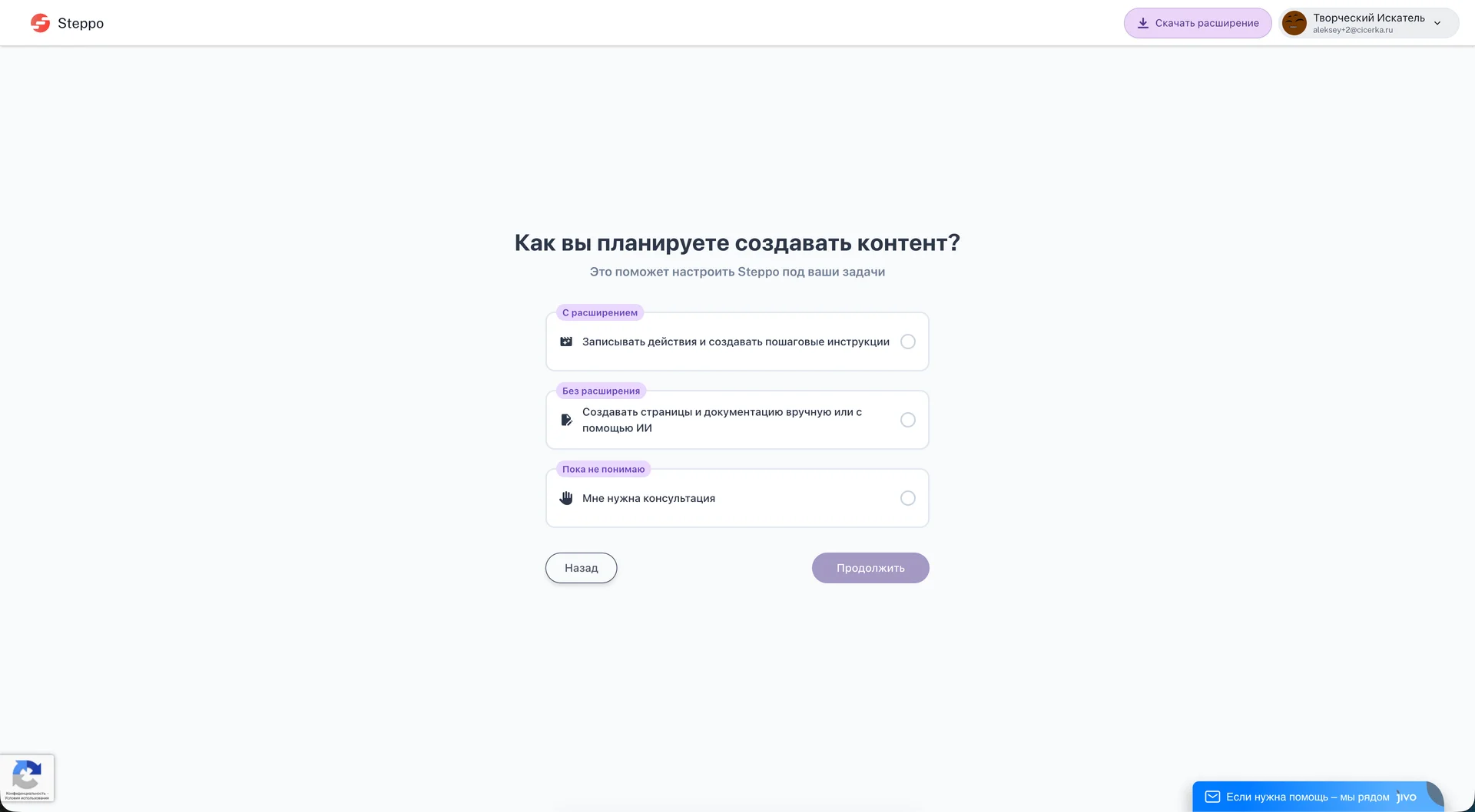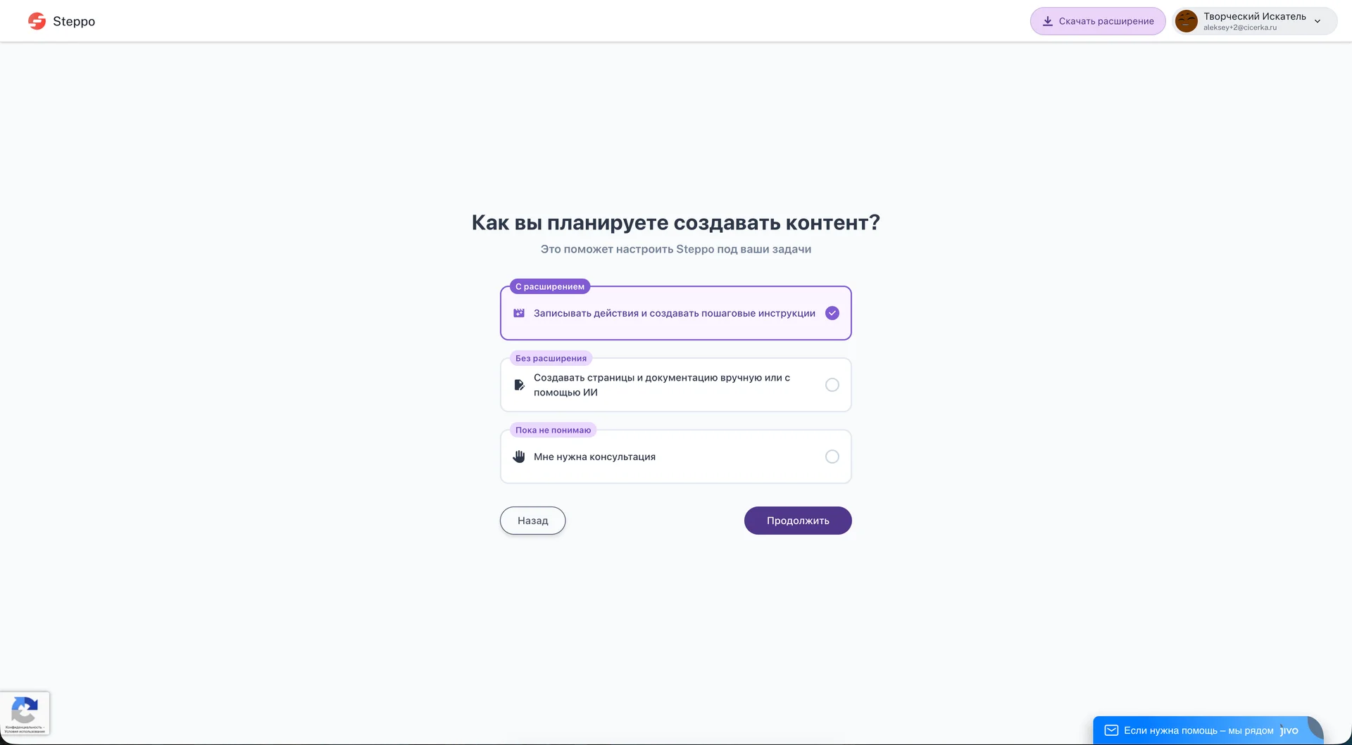 Далее вы сможете выбрать вариант создания контента в Steppo.