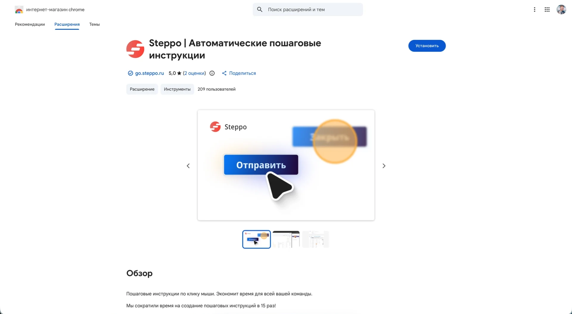 Перейдя в магазин **Chrome Store** нажмите на кнопку `Установить`. Расширение для записи инструкций будет установлено