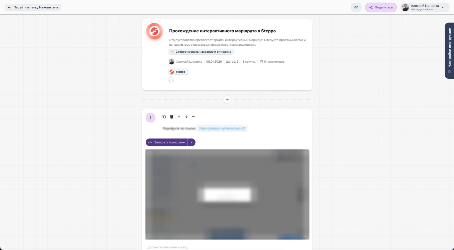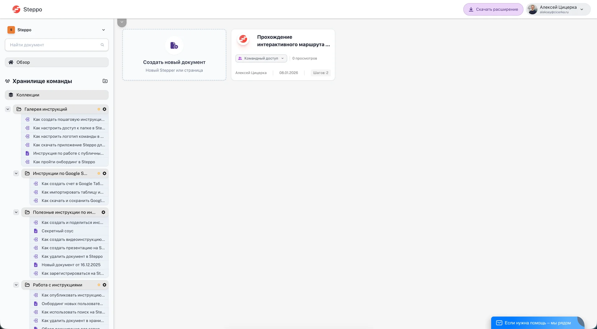 После прохождения интерактивного маршрута вы попадете в готовую инструкцию, а затем сможете перейти в рабочее пространство Steppo, нажав на кнопку навигации слева-сверху